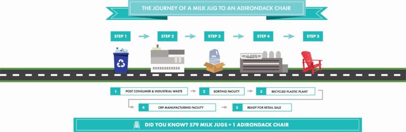 - Sustainable: Like I mentioned before, this furniture is made entirely of recycled plastic. Check out the process below. One Adirondack chair is made out of 579 milk jugs!