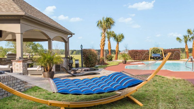 Check out this comfortable pillow-top Hammock shown with a cypress wood Hammock Stand. Multiple Sunbrella fabric colors available to match your existing decor.