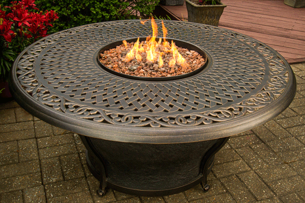 Ovation Round Fire Table. The Bristol Round Gas Firepit Table is a gorgeous centerpiece for gathering. Standard 20lb propane tank fits perfectly underneath the unit (tank not included). Includes a vinyl weather cover. Come see it burn!