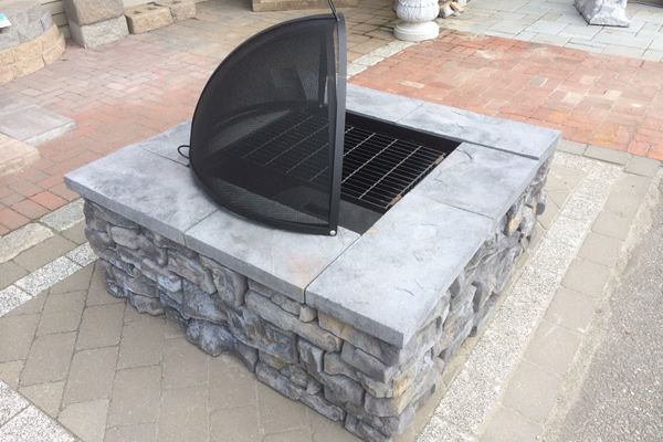 Make a statement in your backyard with one of our best selling Wood Firepits!. This Firepit matches in perfectly with the Redi-Scapes Retaining Wall Block, so it is a perfect match for new or existing projects. Includes a heavy duty metal insert and cooking grate! Two color options available and included with a decorative capstone. Optional spark screen also available.